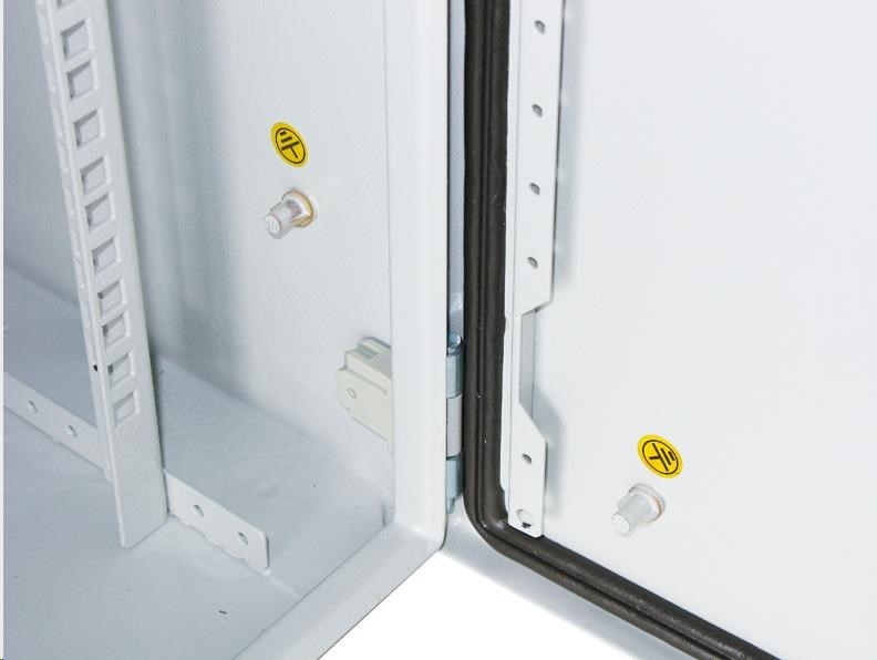 Vonkajší nástenný rozvádzač vyrobený z válcované ocele o hrúbke 1,5 mm. Trojvrstvová povrchová úprava. Ukončenie: dvere - plné, otvárateľné o 110°, 3-bodový zámok, zameniteľný smer otvárania, tesnenie z penového polyuretánu zádny kryt - plný bočný kryt - plný horný kryt - plný