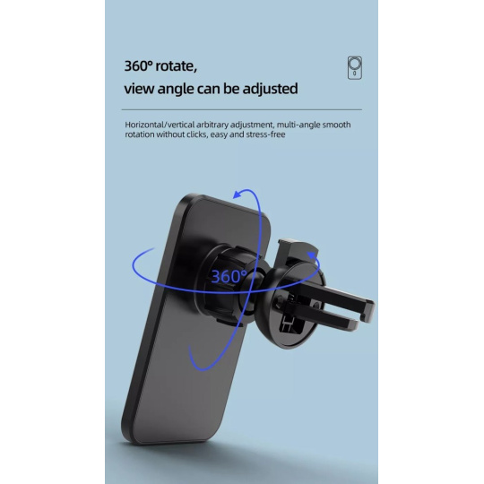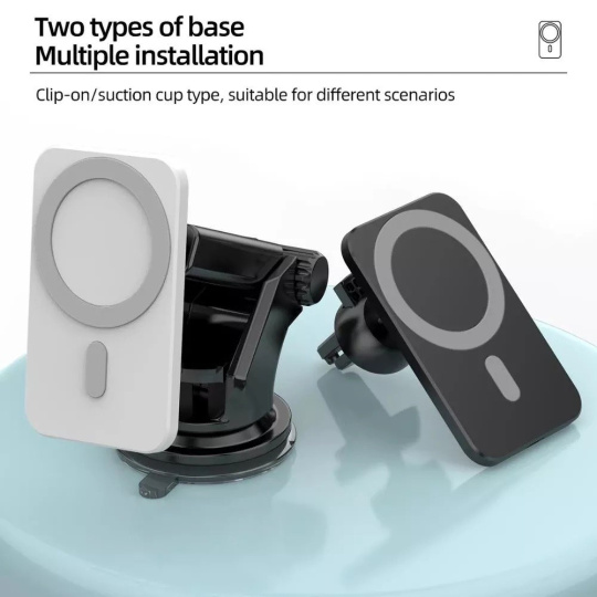 Vysoko kvalitná výkonná bezdrôtová magnetická nabíjačka do auta s podporou Apple MagSafe. Vybavená dvomi držiakmi, môžete si vybrať buď variant do ventilácie, alebo otočný a výsuvný držiak s prísavkou.