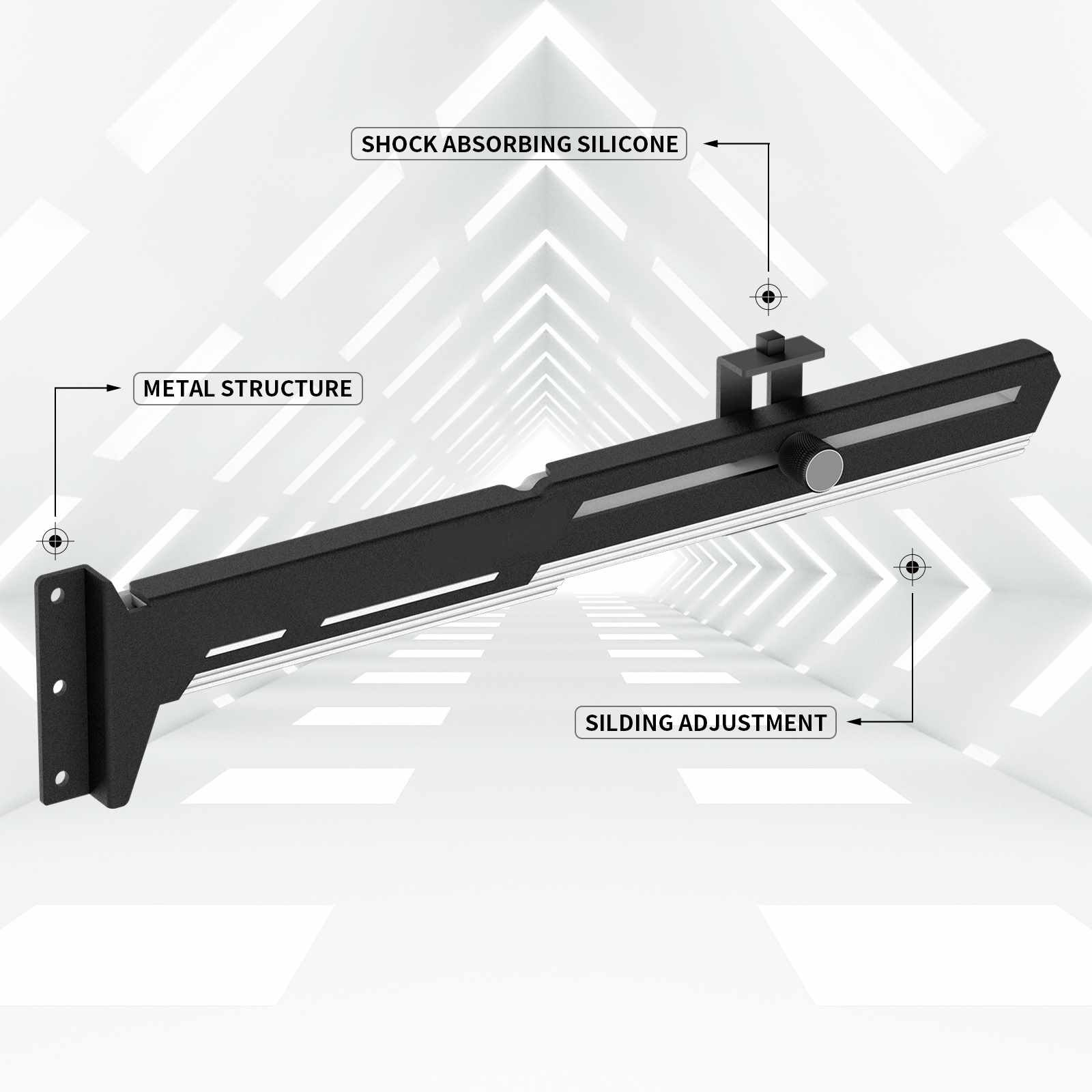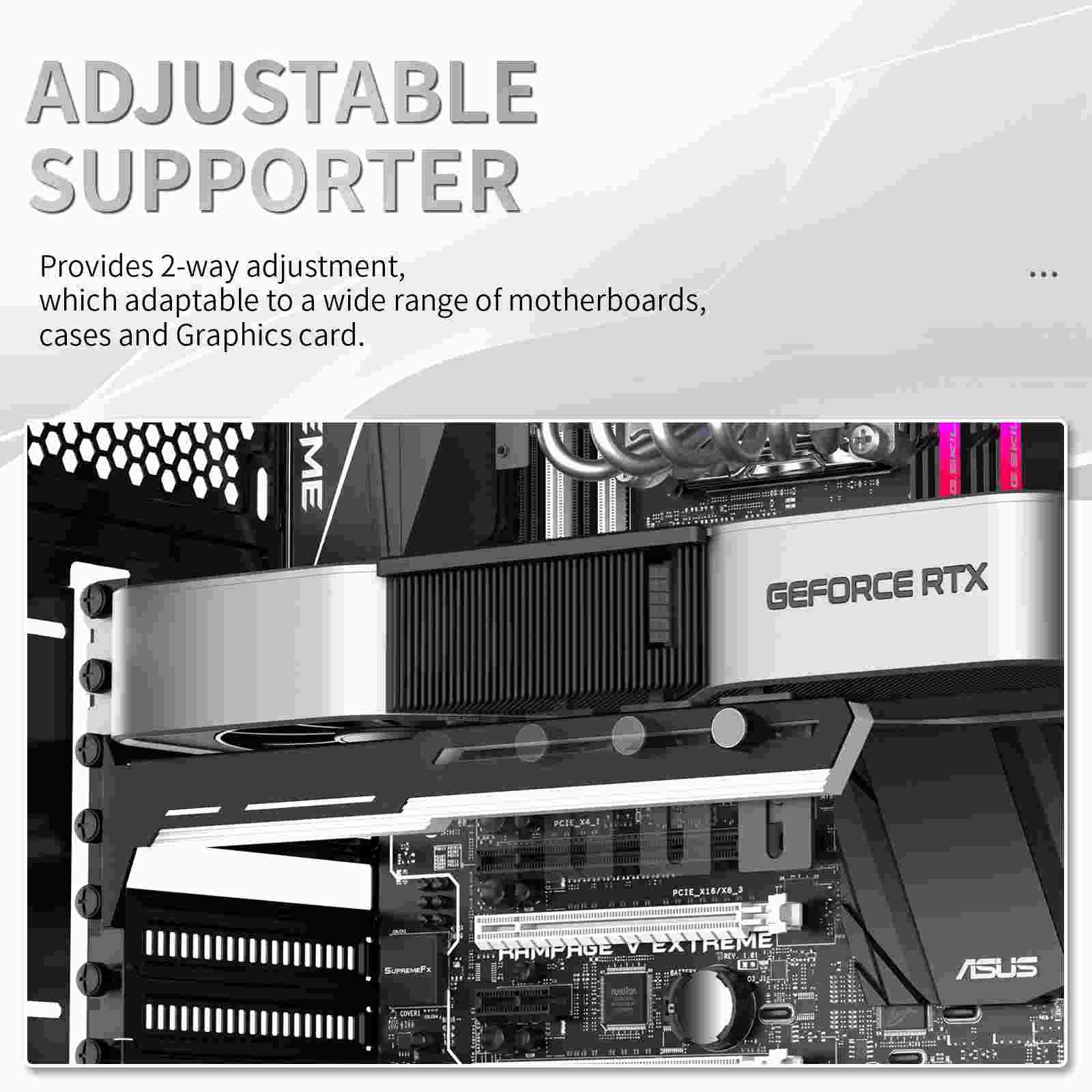 Štýlová verzia tejto opory vašej grafickej karty je vyrobená z oceľového práškovo lakovaného plechu a plastu, zabraňuje prehýbaniu väčších kariet v zásuvke a dodáva tak zostave lepšiu celkovú stabilitu. Súčasťou je silikonová posuvná opora, ktorú je možné posunúť ako horizontálne, tak aj vertikálne a umožňuje inštaláciu na rôznych miestach karty, pre maximálnu kompatibilitu s väčšinou kariet. Rozmery držiaku sú 280 x 52 mm.