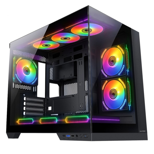 Napriek kompaktným rozmerom ponúka priestor až pre 400mm dlhé grafické karty, 176mm vysoké chladiče a vodné chladenie až do veľkosti 360 mm. Uvnitr nájdeš bohaté možnosti osadenia ventilátorov (až 9 kusov 120/140 mm), môžeš si vybrať z viacerých variantov 1stCOOL ventilátorov vrátane aRGB riešení, prípadne doplniť aj aRGB držiak grafickej karty.