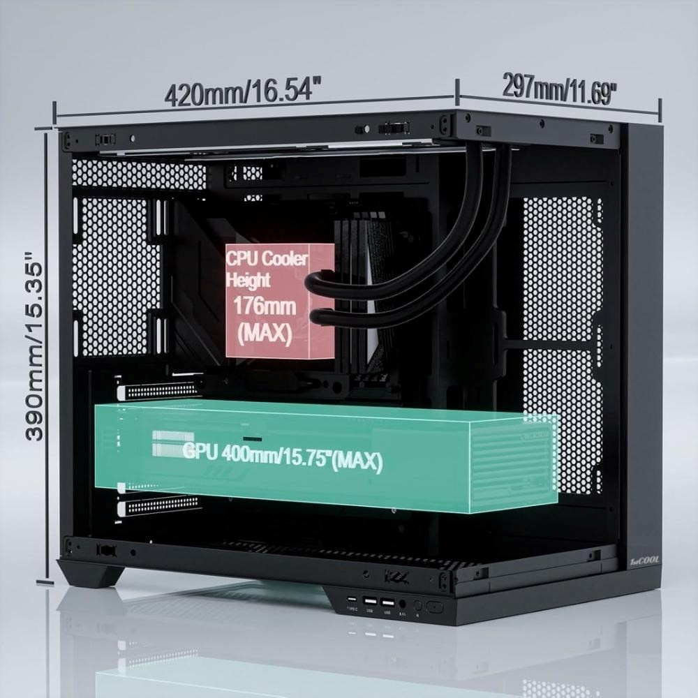 Napriek kompaktným rozmerom ponúka priestor až pre 400mm dlhé grafické karty, 176mm vysoké chladiče a vodné chladenie až do veľkosti 360 mm. Uvnitr nájdeš bohaté možnosti osadenia ventilátorov (až 9 kusov 120/140 mm), môžeš si vybrať z viacerých variantov 1stCOOL ventilátorov vrátane aRGB riešení, prípadne doplniť aj aRGB držiak grafickej karty.