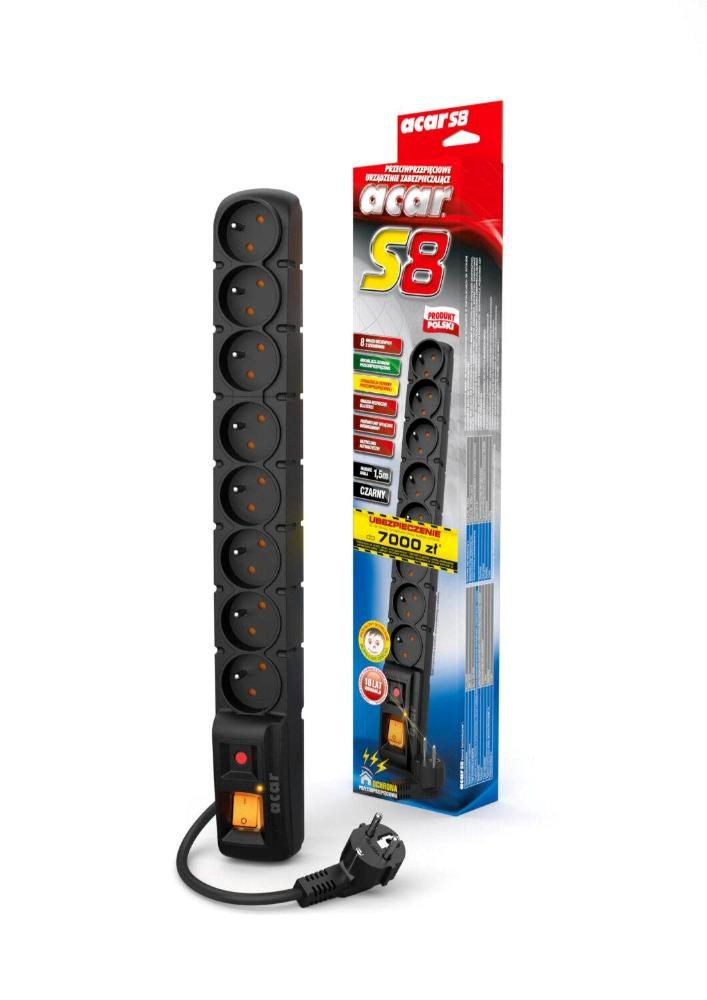 Acar S8 1.5m kábel, 8 zásuviek, prepäťová ochrana, čierna