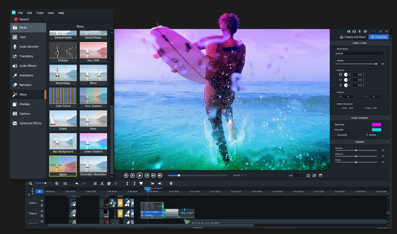 - Kľúčové snímky – použite kľúčové snímky na médiá a získajte presnú kontrolu nad vlastnosťami, ako je nepriehľadnosť, poloha, mierka, otočenie osi XYZ a orezanie. Kľúčové snímky môžete použiť aj na ovládanie úrovní zvuku, hlasitosti kanála, vyváženia a výšky tónu.