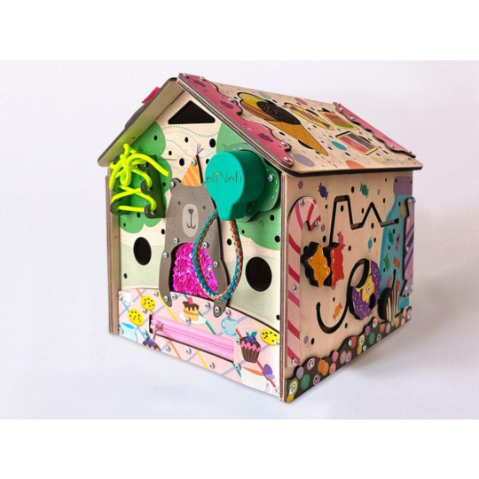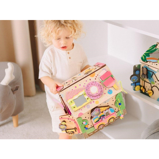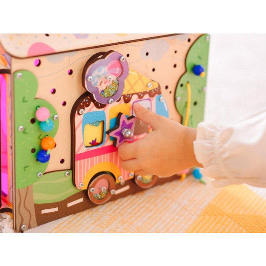 Originálny svietiaci domček activity board zavádza deti do fantastického sveta sladkostí. So zmrzlinovým autom, s mlsným medvedíkom a so striebrou montessori a hracích prvkov sa deti vydajú za sladkým dobrodružstvom, pri ktorom sa skvele zabavia a zdokonalia svoje zručnosti. Každá strana activity boardu je originálna a ponúka nespočet možností na hru. Acitivity board domček Cukrovinky je navyše svietiaci, po zapnutí svetla sa vo vnútri domčeka rozsvieti ružové svetlo.