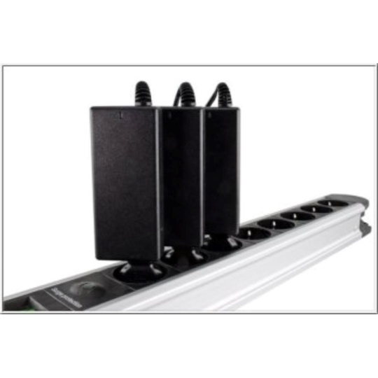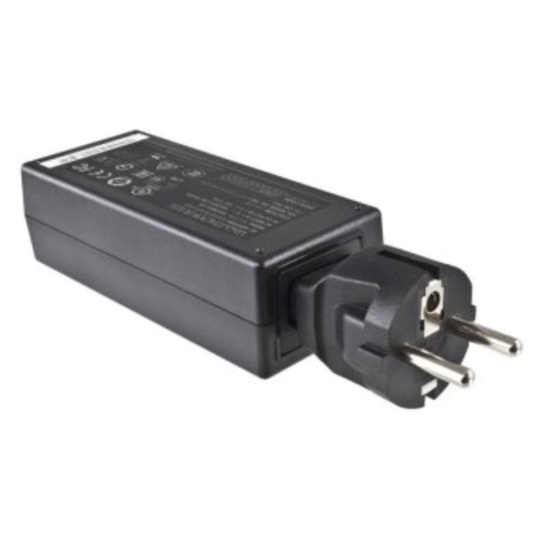 Napájací adaptér v čiernom prevedení, so vstupným konektorom CEE 7/7 a výstupným IEC C13. Výstupná zásuvka je rovná, nemeckého typu, s ochrannými plieškami po stranách, vhodná na pripojenie vidlice, ktorá je vybavená zemniacimi plieškami po stranách.