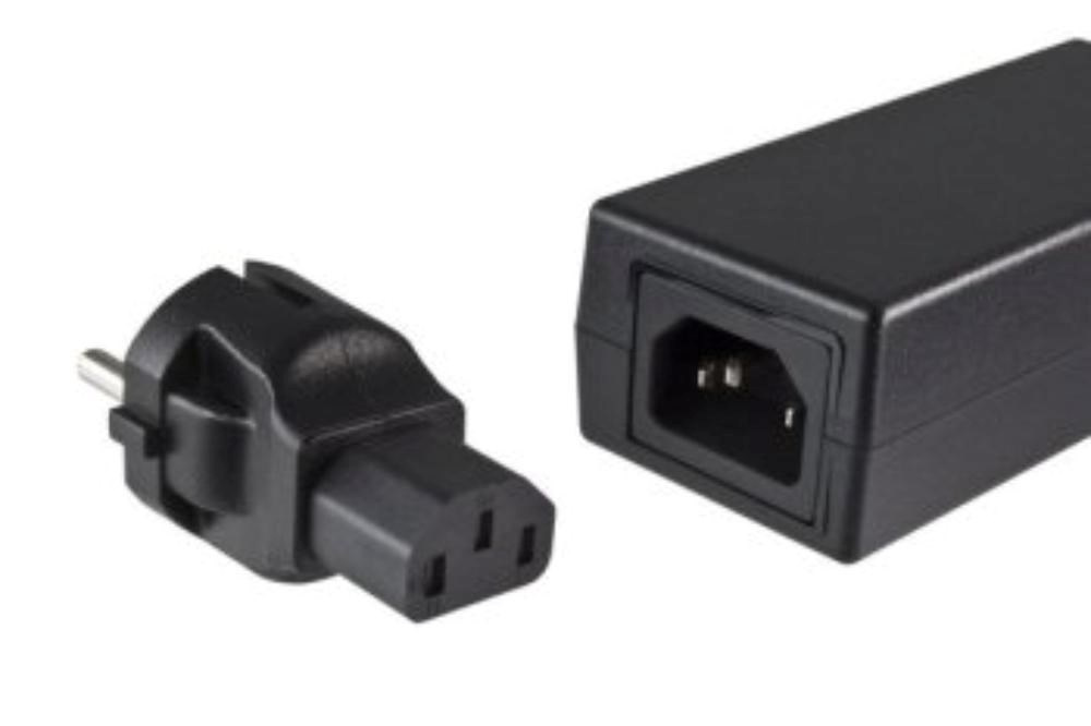 Napájací adaptér v čiernom prevedení, so vstupným konektorom CEE 7/7 a výstupným IEC C13. Výstupná zásuvka je rovná, nemeckého typu, s ochrannými plieškami po stranách, vhodná na pripojenie vidlice, ktorá je vybavená zemniacimi plieškami po stranách.