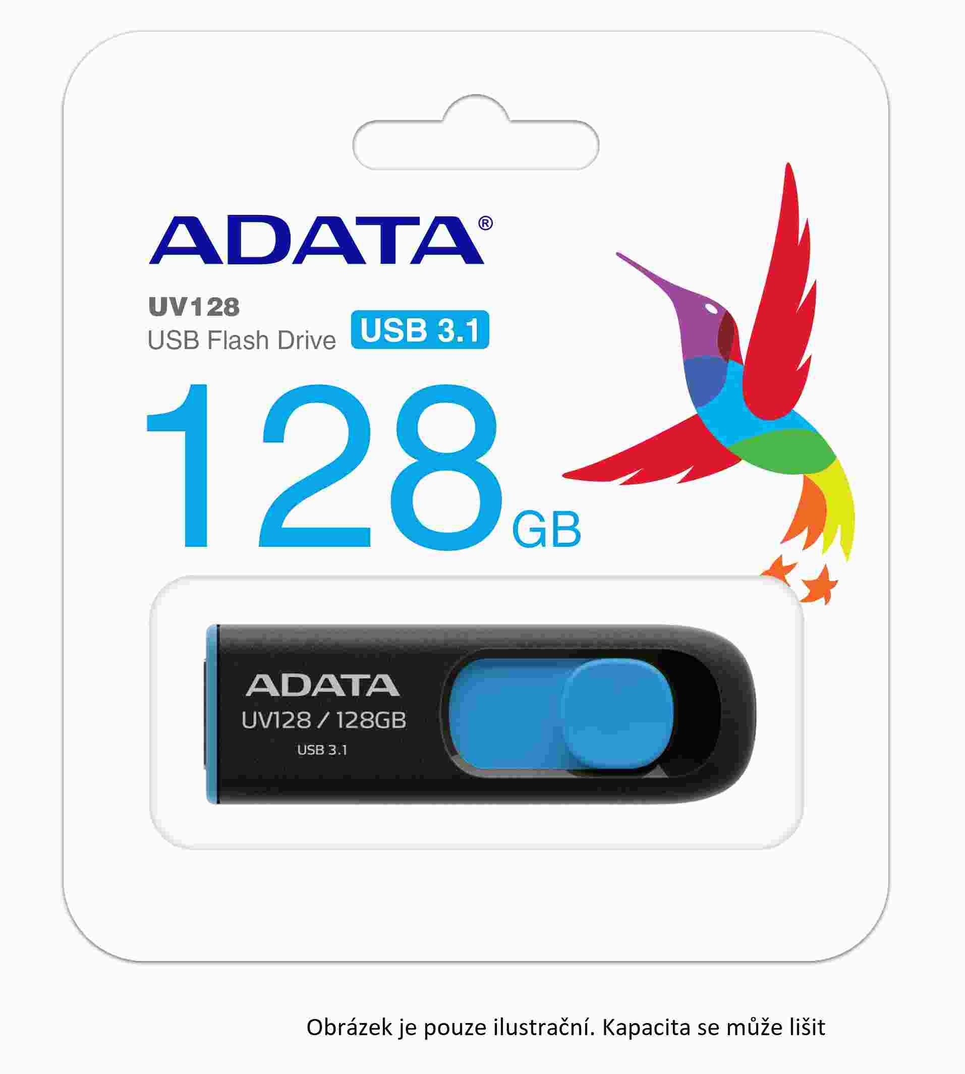 ADATA Flash Disk 64GB UV128, USB 3.1 Dash Drive (R:90/W:40 MB/s) čierna/modrá
