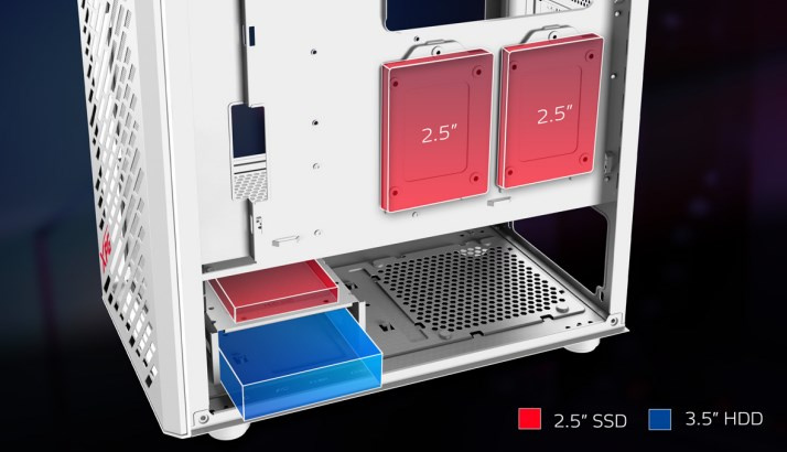 Dve odnímateľné 2,5” HDD/SSD dosky pre jednoduchšiu montáž alebo výmenu. Používatelia môžu tiež nainštalovať klietku HDD a pridať buď dva 3,5" alebo 2,5" plus 3,5" disk pod prednú stranu krytu PSU. Klietka HDD je dodávaná ako príslušenstvo pri rozbalení XPG VALOR AIR, ako flexibilná možnosť, z ktorej si môžu používatelia vybrať pri inštalácii úložiska.