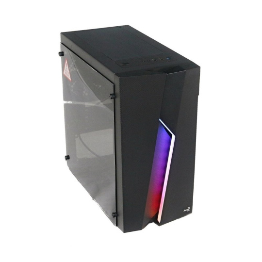 Počítačová skriňa s sklenným bočným krytom a RGB podsvietením panelu.