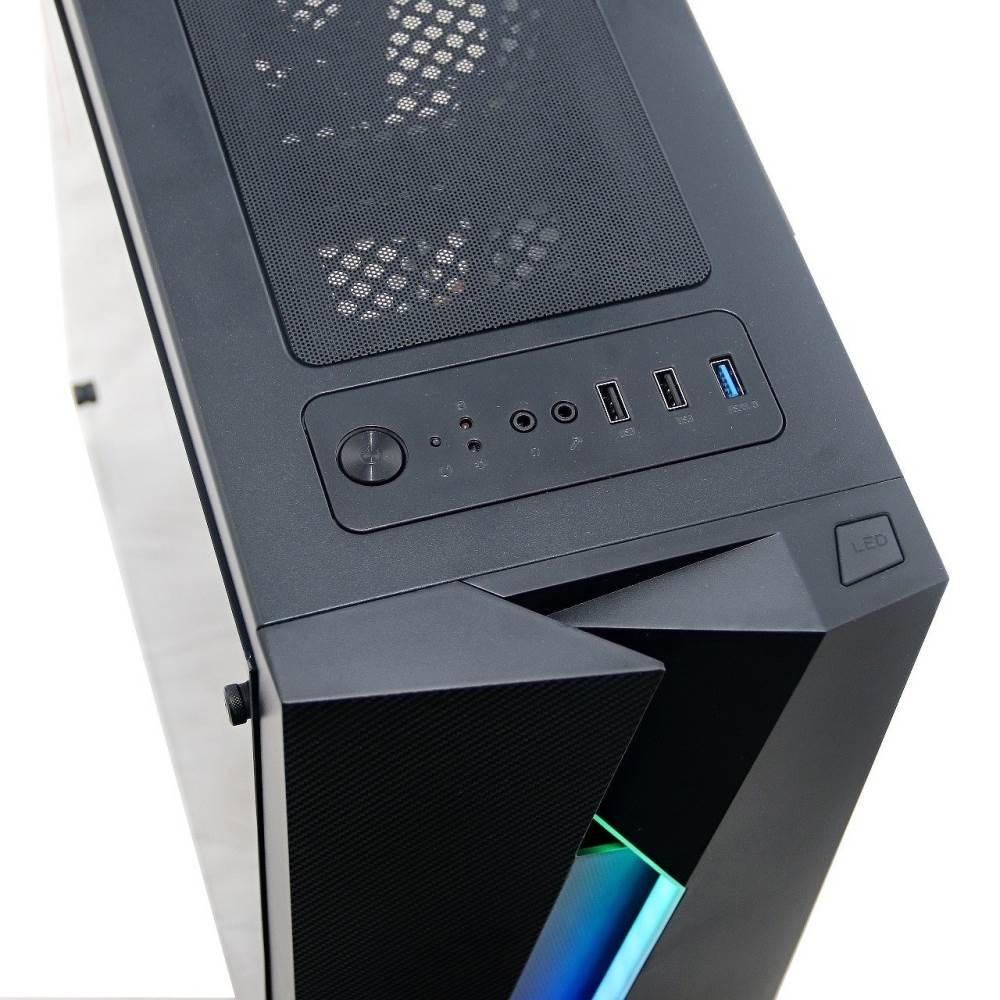 Počítačová skriňa s sklenným bočným krytom a RGB podsvietením panelu.