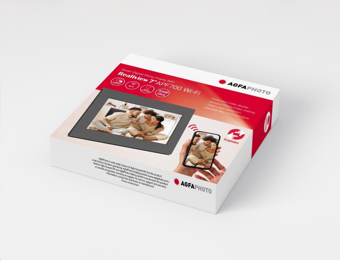 Aplikácia FRAMEO, ktorá je kompatibilná s iOS aj Androidom, umožňuje online fotoaparátu s fotorámčekom APF700WIFI prijímať fotografie a videá odoslané zo smartphonu kdekoľvek na svete. Odoslaný materiál môže byť dokonca doplnený správou. Jeho použitie je dostupné všetkým: keď je zariadenie zapnuté, v prezentácii sa automaticky zobrazujú nové fotografie a videá. Všetko, čo potrebujete, je pripojenie k internetu. Je to jednoduché, bezplatné a úplne bezpečné. Kamera má tiež zabudované hodiny a funkciu počasia, vďaka čomu je veľmi praktickým každodenným predmetom.