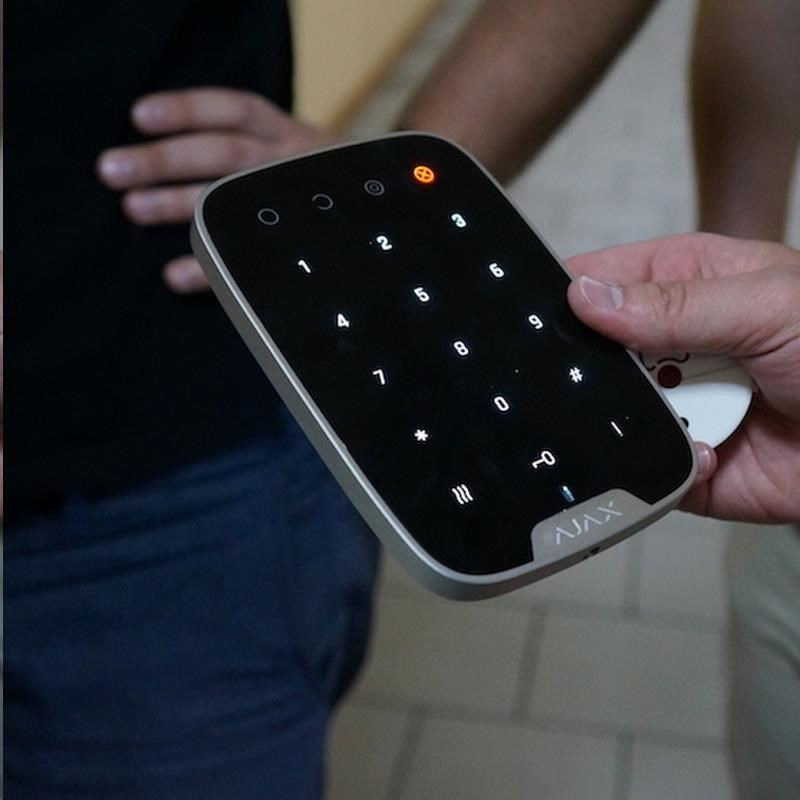 Ajax KeyPad je bezdrôtová dotyková klávesnica umožňujúca jednoduché ovládanie zabezpečovacieho systému zadaním číselného hesla alebo stlačením tlačidla. V krízovej situácii je možné tiež diskrétne spustiť tichý poplach.