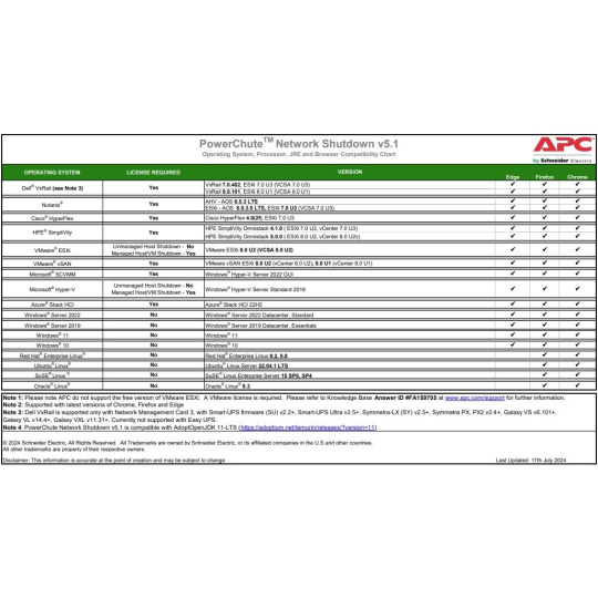 Licencia pre sieťové vypnutie PowerChute na 3 roky. Licenčné obdobie začína aktiváciou licence koncovým používateľom. Jednoduchá integrácia so všetkými dodávateľmi virtualizácie a HCI. V prípade výpadku napájania umožňuje APC UPS plynulé vypnutie systému zariadení.