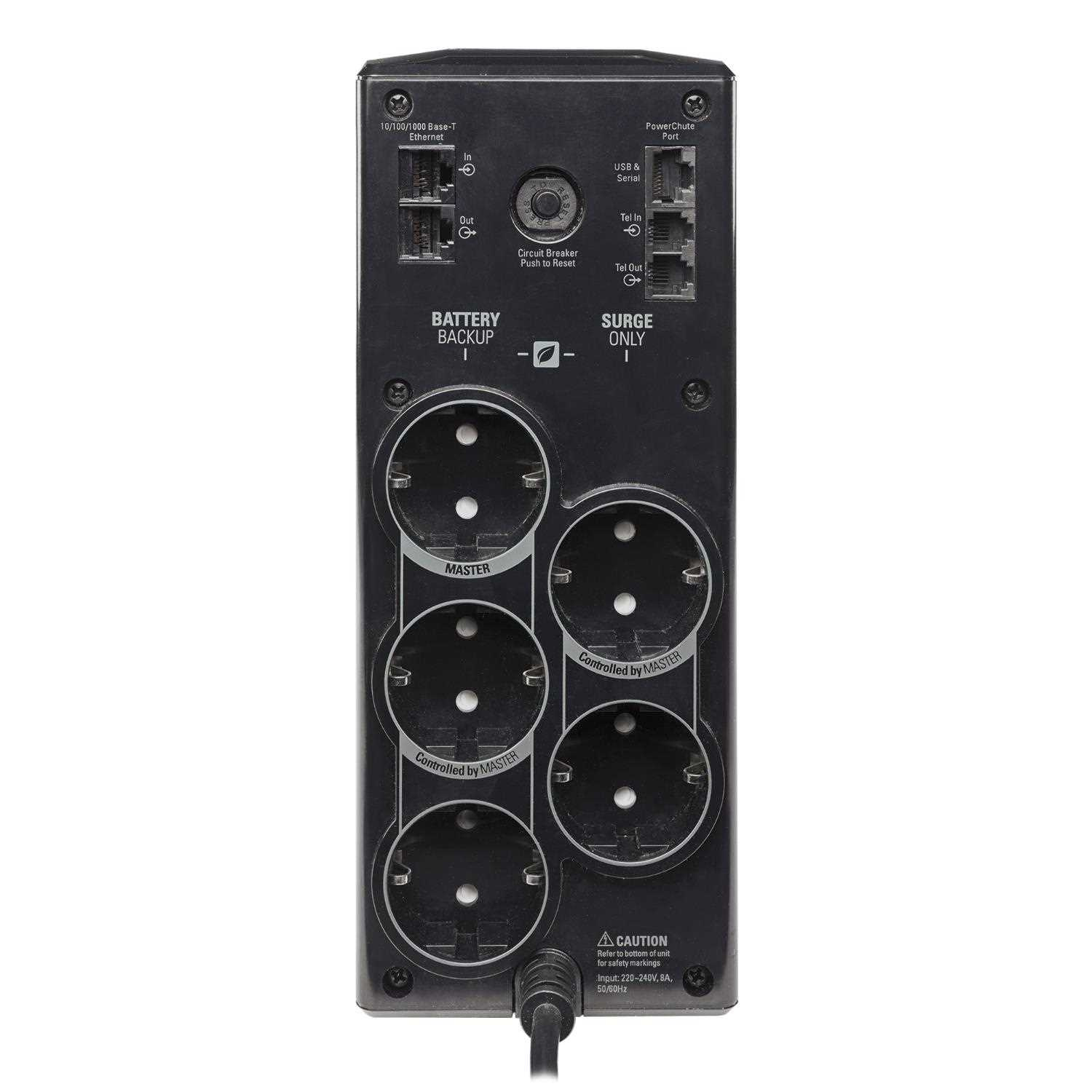 | Typ zásuviek | RJ-11 In/Out RJ45 Base-T Ethernet (3) Schuko (výstup - záložná prevádzka na batérie) (2) Schuko (výstup - prepäťová ochrana) na ochranu laserových tlačiarní, skenerov alebo iných zariadení s vysokým výkonom |