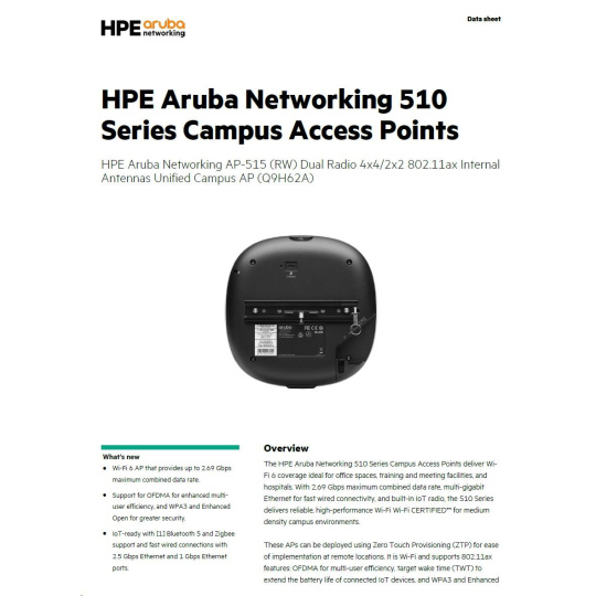 HPE Aruba Networking AP-515 (RW)AP-515 (RW) Dual Radio 4x4:4 + 2x2:2 802.11ax Internal Antennas Unified Campus AP Q9H62A