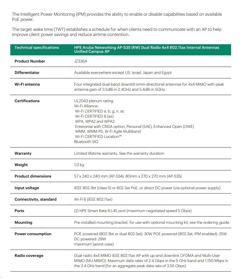 Aruba AP-535 (RW) Dual Radio 4x4:4 802.11ax Internal Antennas Unified Campus AP RENEW JZ336A