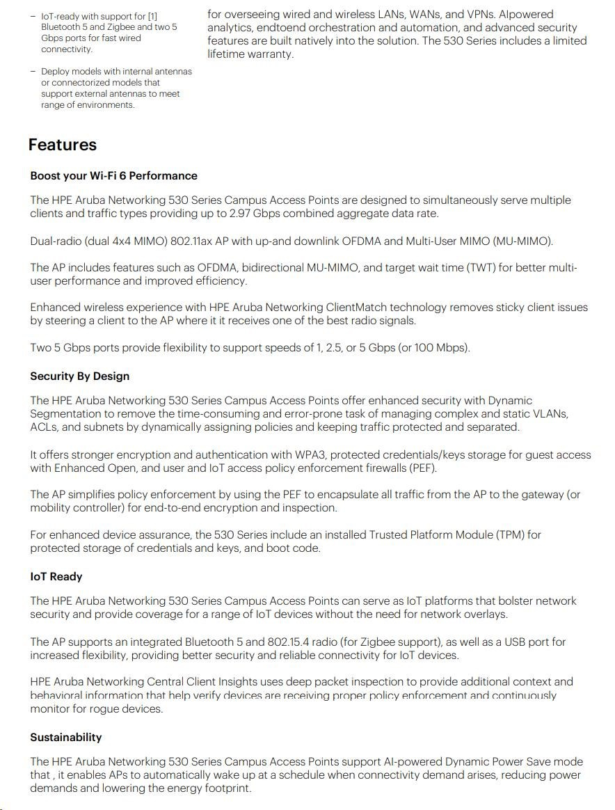 Like all Aruba Wi-Fi 6 APs, the 530 Series includes an integrated Bluetooth 5 and 802.15.4 radio (for Zigbee support) to simplify deploying and managing IoT-based location services, asset tracking services, security solutions and IoT sensors. This allows organizations to leverage the Aruba 530 Series as an IoT platform, which eliminates the need for an overlay infrastructure and additional IT resources.