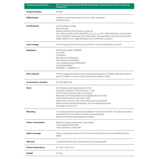 Aruba AP-615 (RW) Dual-radio Tri-band 2x2:2 802.11ax Wi-Fi 6E Internal Antennas Campus AP RENEW R7J49A