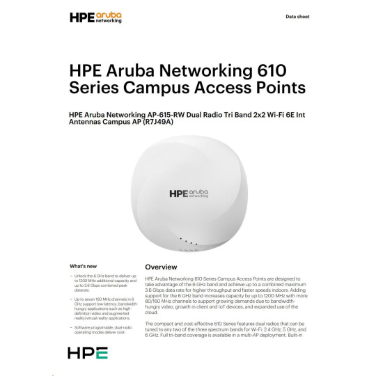 Aruba 610 Series Access Points are designed to take advantage of the 6 GHz band using two radios that can deliver comprehensive tri-band coverage in a multi-AP environment and better meet the growing demands of Wi-Fi due to increased use of video, growth in client and IoT devices, and expanded use of cloud. With a 3.6 Gbps combined peak data rate for higher throughput and faster speeds for indoor use, the Aruba 610 Series delivers a cost-effective enterprise Wi-Fi 6E solution with increased capacity, wider channels, reduced power consumption.