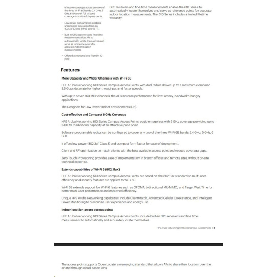 In addition, Aruba's Wi-Fi 6 and 6E APs support Open Locate, an emerging standard that allows APs to share their location over the air and through cloud-based APIs, enabling mobile devices to locate themselves and applications to support network analytics.