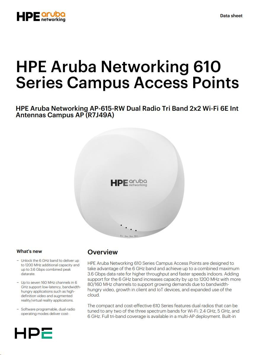 Aruba 610 Series Access Points are designed to take advantage of the 6 GHz band using two radios that can deliver comprehensive tri-band coverage in a multi-AP environment and better meet the growing demands of Wi-Fi due to increased use of video, growth in client and IoT devices, and expanded use of cloud. With a 3.6 Gbps combined peak data rate for higher throughput and faster speeds for indoor use, the Aruba 610 Series delivers a cost-effective enterprise Wi-Fi 6E solution with increased capacity, wider channels, reduced power consumption.