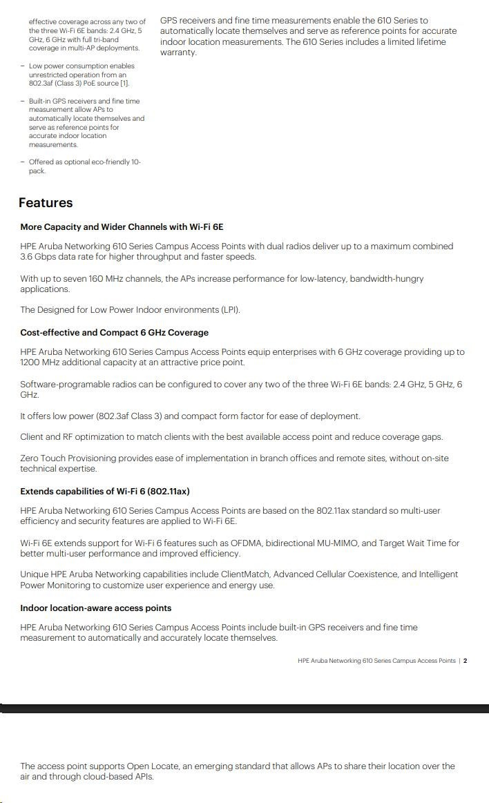 In addition, Aruba's Wi-Fi 6 and 6E APs support Open Locate, an emerging standard that allows APs to share their location over the air and through cloud-based APIs, enabling mobile devices to locate themselves and applications to support network analytics.