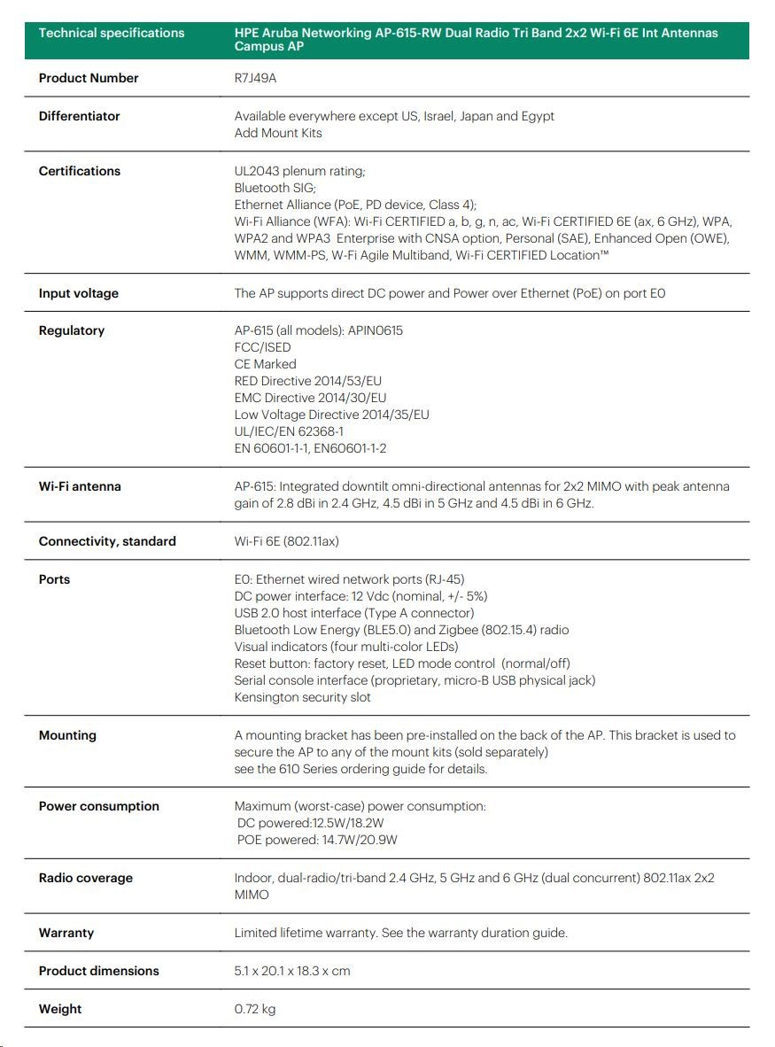 Aruba AP-615 (RW) Dual-radio Tri-band 2x2:2 802.11ax Wi-Fi 6E Internal Antennas Campus AP RENEW R7J49A