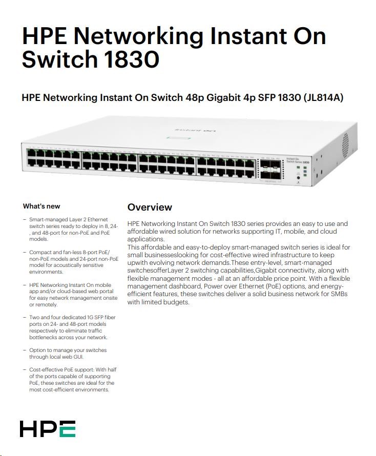 Aruba Instant On 1830 8G Switch (JL810A) | Aruba Instant On 1830 8G 4p Class4 PoE 65W Switch (JL811A) | Aruba Instant On 1830 24G 2SFP Switch (JL812A) | Aruba Instant On 1830 24G 12p Class4 PoE 2SFP 195W Switch (JL813A) | Aruba Instant On 1830 48G 4SFP Switch (JL814A) | Aruba Instant On 1830 48G 24p Class4 PoE 4SFP 370W Switch (JL815A) | ||||