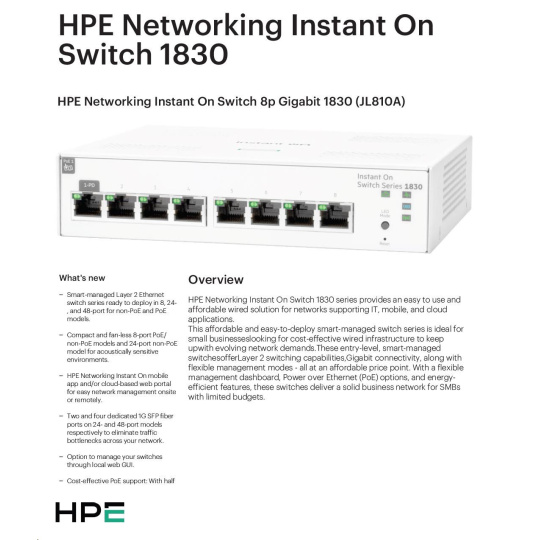 | Aruba Instant On 1830 8G Switch (JL810A) | Aruba Instant On 1830 8G 4p Class4 PoE 65W Switch (JL811A) | Aruba Instant On 1830 24G 2SFP Switch (JL812A) | Aruba Instant On 1830 24G 12p Class4 PoE 2SFP 195W Switch (JL813A) | Aruba Instant On 1830 48G 4SFP Switch (JL814A) | Aruba Instant On 1830 48G 24p Class4 PoE 4SFP 370W Switch (JL815A) | ||||||||