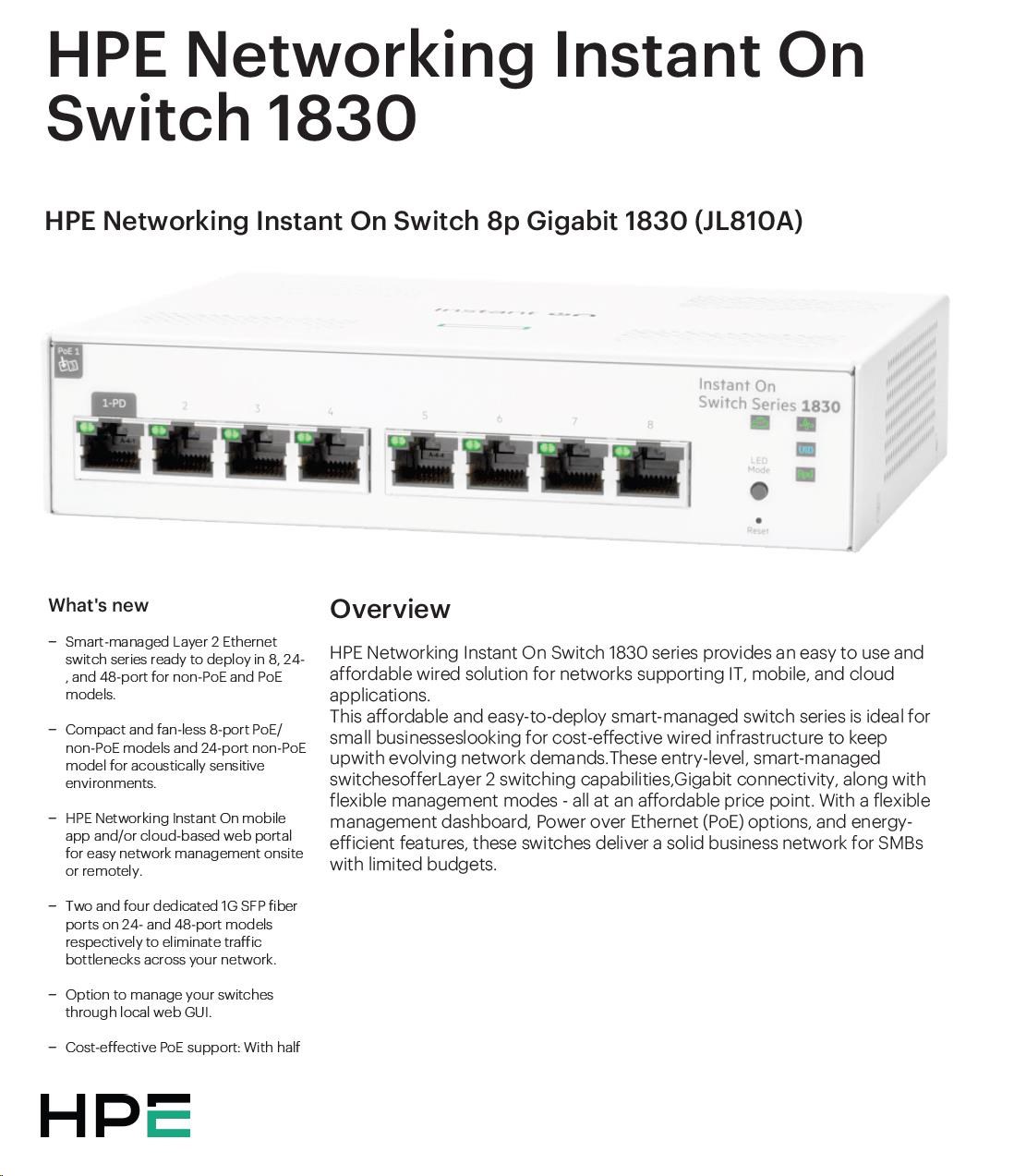Aruba Instant On 1830 8G Switch (JL810A) | Aruba Instant On 1830 8G 4p Class4 PoE 65W Switch (JL811A) | Aruba Instant On 1830 24G 2SFP Switch (JL812A) | Aruba Instant On 1830 24G 12p Class4 PoE 2SFP 195W Switch (JL813A) | Aruba Instant On 1830 48G 4SFP Switch (JL814A) | Aruba Instant On 1830 48G 24p Class4 PoE 4SFP 370W Switch (JL815A) | ||||