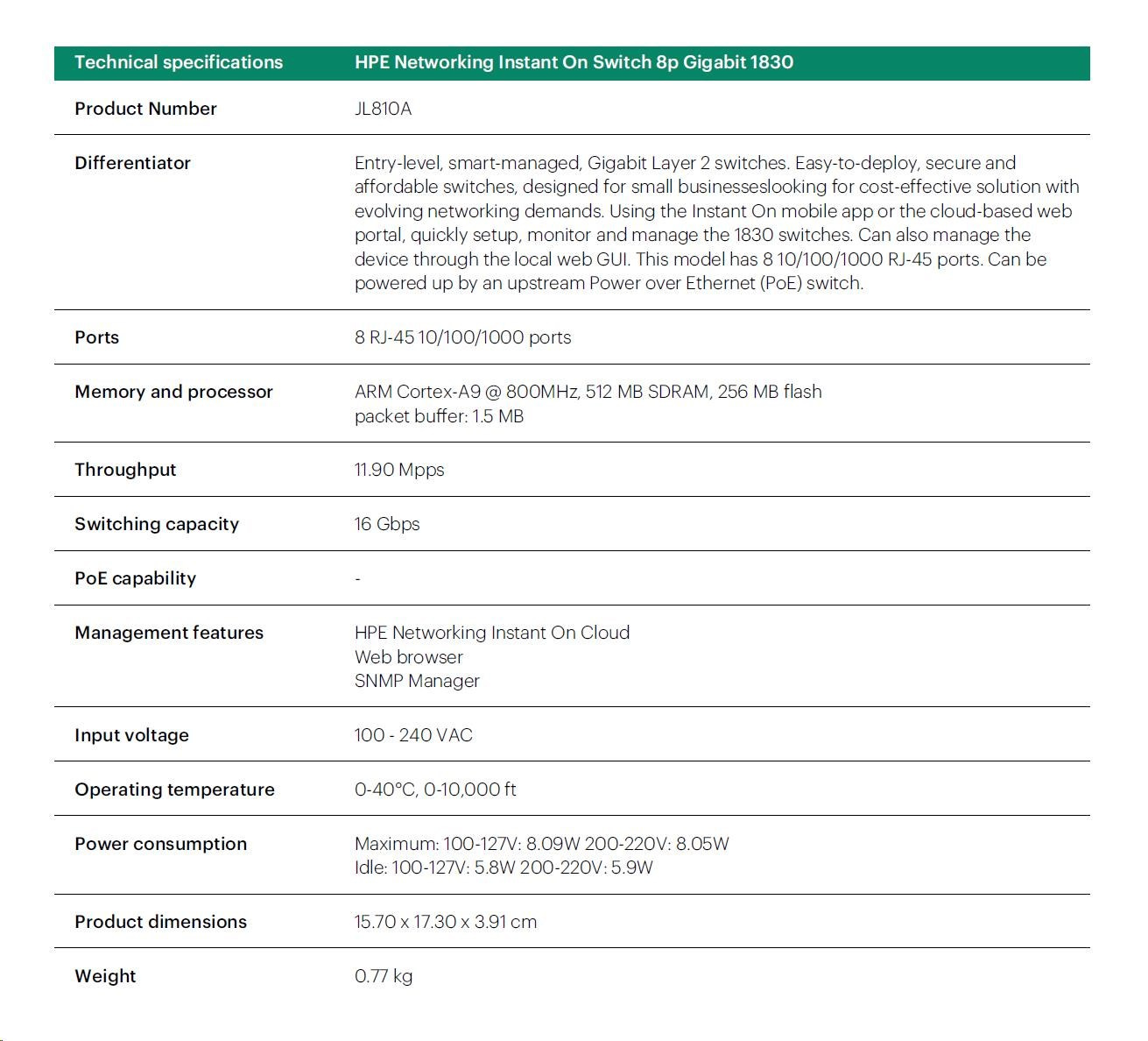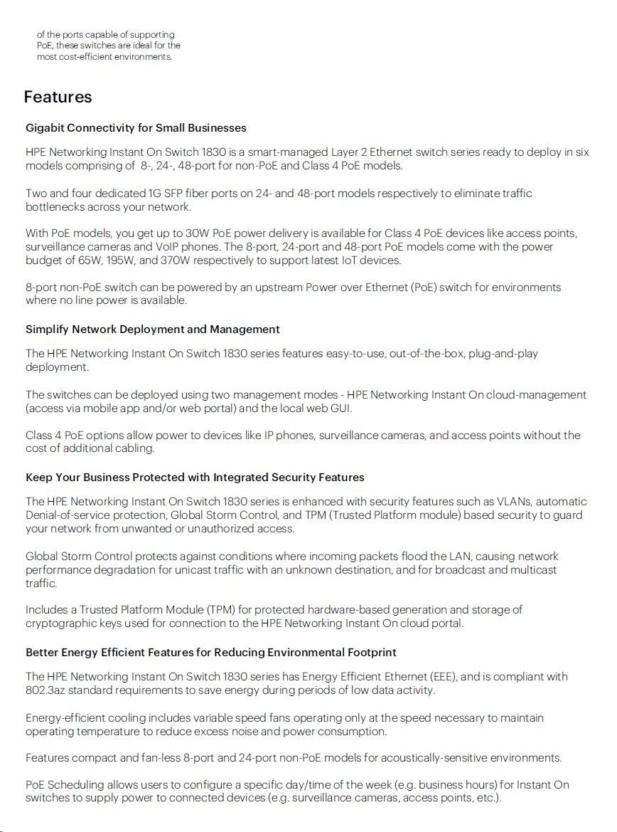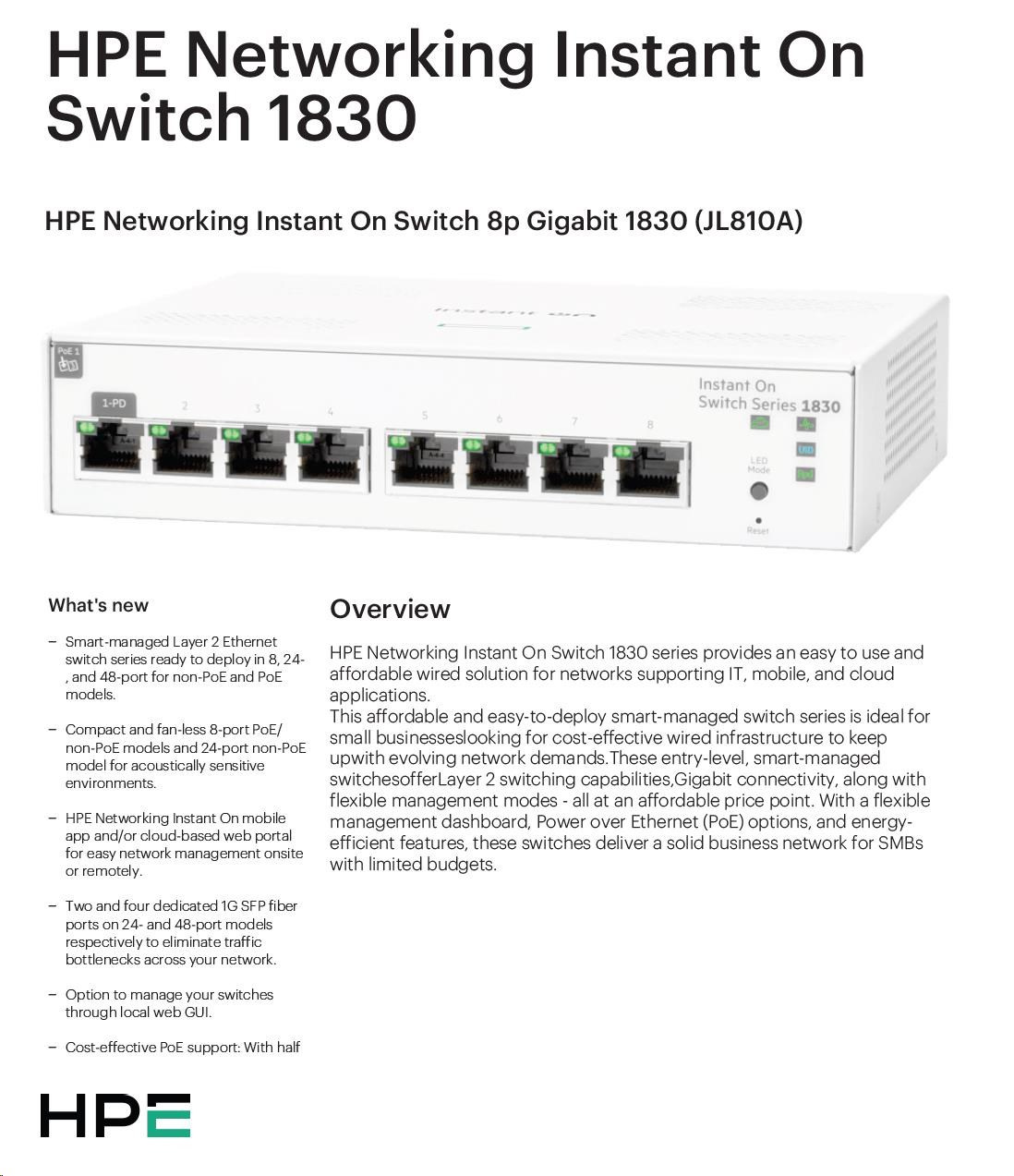 | Aruba Instant On 1830 8G Switch (JL810A) | Aruba Instant On 1830 8G 4p Class4 PoE 65W Switch (JL811A) | Aruba Instant On 1830 24G 2SFP Switch (JL812A) | Aruba Instant On 1830 24G 12p Class4 PoE 2SFP 195W Switch (JL813A) | Aruba Instant On 1830 48G 4SFP Switch (JL814A) | Aruba Instant On 1830 48G 24p Class4 PoE 4SFP 370W Switch (JL815A) | ||||||||