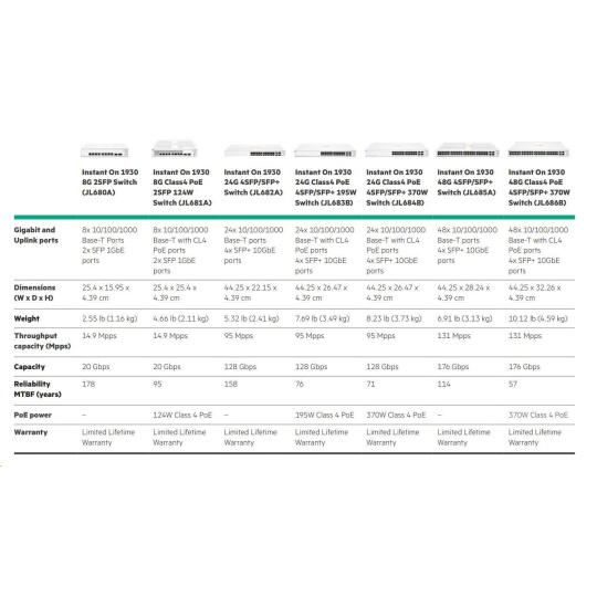 | The Instant On Differentiators Easy setup and management The Aruba Instant On mobile app allows you to set up, manage, and monitor Instant On switches and access points directly from your phone. Within the app, you get guided step-by-step instructions to install Instant On devices to get your network up and running quickly - no technical expertise required. And cloud-based access allows you to access the network from anywhere, at any time. Non-intrusive, aesthetic design Aruba Instant On switches are designed to complement the sleek and clean look of the Instant On access points, and to blend discreetly into your site's environment. The 8-port models, as well as the 24- and 48-port non PoE+ models, are fan-less, making them ideal for quiet office deployments. High performance with flexible options The series consists of four (4) Class 4 PoE (PoE+) switches, and three (3) non-POE switches including 8- 24- and 48-port Gigabit Ethernet switches. The two (2) dedicated 1G SFP fiber ports on 8-port models, and four (4) dedicated 1G/10G SFP+ fiber ports on 24-/48-port models, ensure high performance and eliminate traffic bottlenecks across the network. Customizable features include basic Layer 2 features like VLANs and link aggregation, as well as advanced features such as Layer 3 IPv4 static routing, ACLs, and Spanning Tree Protocols, and IPv6 Host mode. Optimized user experience The Aruba Instant On mobile app provides common workflows for Instant On switches and access points making it easier to configure, monitor and manage your network remotely without the need for additional hardware like cloud keys or VPN. You can also update firmware on your Instant On devices directly from the cloud whenever you want, from wherever you are. Site inventory The site inventory feature on the Instant On mobile app shows you all switches and AP's on a single screen, allowing you to quickly identify non-functioning devices and troubleshoot accordingly. Multi-site management The cloud-hosted web interface and mobile app make it easy to manage multiple sites, multiple networks, distributed deployments and multi-tenant deployments. Each site is logically separated and has its own configuration, statistics, guest portal, and admin read/write privileges. Built-in security Built-in security features protect your network from external threats by blocking malware attacks and keeping unauthorized users off the network. Network traffic can be filtered and access restricted based on MAC and IP address. No hidden fees All features are included in the price of the hardware - there are no recurring subscription or licensing fees. Expert-level support and industry leading limited lifetime warranty are also included, along with chat support for the life of the product. |