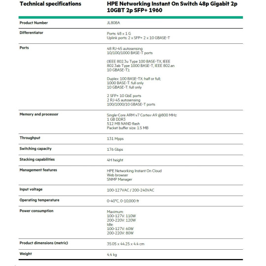 HPE Networking Instant On Switch 48p Gigabit 2p 10GBT 2p SFP+ 1960 (JL808A)
