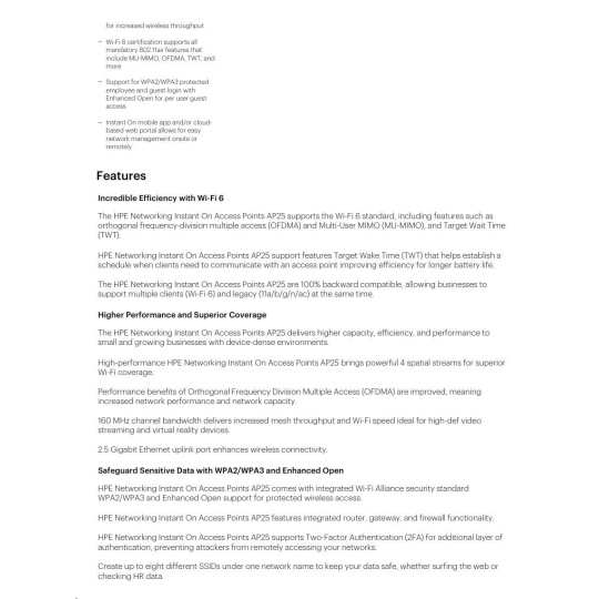 The Wi-Fi Certified 6TM AP25 delivers faster Wi-Fi speeds, greater capacity, and reduced latency between access points and devices for a superior Wi-Fi experi­ence. AP25 improves efficiency and reduces congestion for networks with many connected devices, making it ideal for high-density environments. And with 4x the capacity of 802.11ac access points, the AP25 provides exceptional user experience, allowing businesses to serve more customers with higher speed and less congestion.
