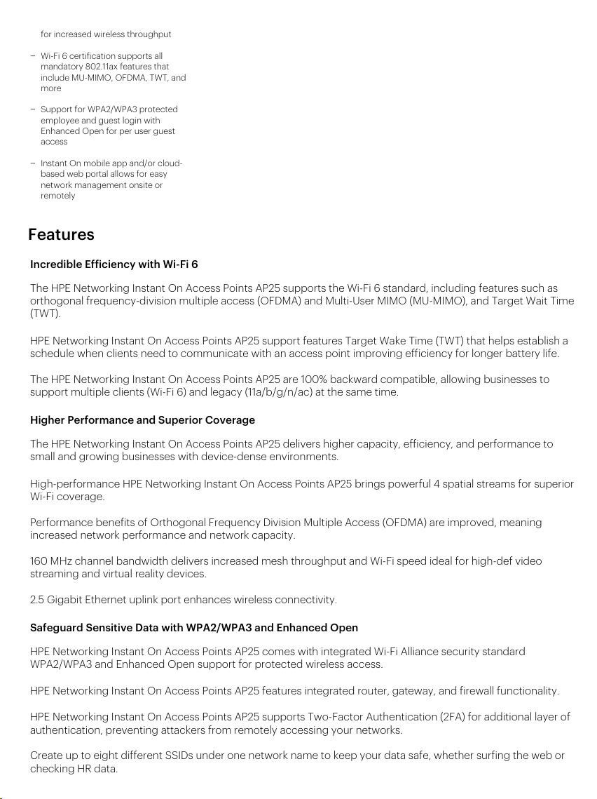 The Wi-Fi Certified 6TM AP25 delivers faster Wi-Fi speeds, greater capacity, and reduced latency between access points and devices for a superior Wi-Fi experi­ence. AP25 improves efficiency and reduces congestion for networks with many connected devices, making it ideal for high-density environments. And with 4x the capacity of 802.11ac access points, the AP25 provides exceptional user experience, allowing businesses to serve more customers with higher speed and less congestion.