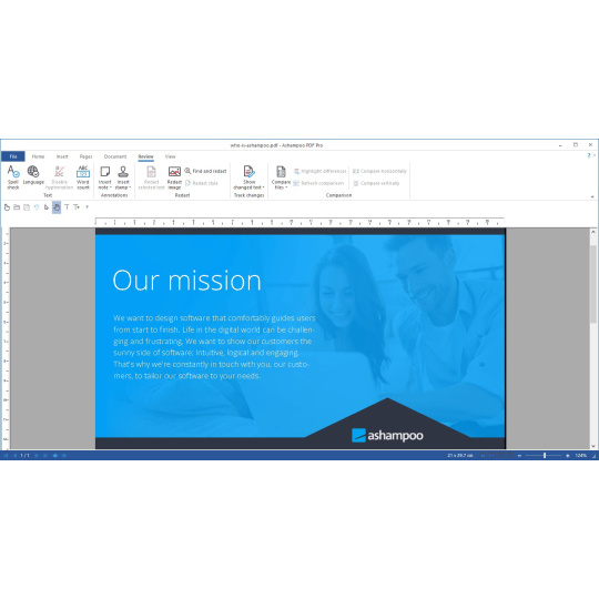 Ashampoo PDF Pro 5 předvídá vaše potřeby a poskytuje znatelné pohodlí při každodenním používání. Když otevřete PDF soubor z Průzkumníka Windows, zobrazí se nyní jako nová karta ve vašem stávajícím okně. Nové zobrazení Rozvržení knihy zobrazuje dvě stránky vedle sebe, stejně jako skutečná kniha, a posouvání po stránkách umožňuje přesunout se přesně o jednu stránku na jedno otočení kolečka myši. Přetáhněte dva soubory PDF do programu a spusťte okamžité porovnání dokumentů, abyste na první pohled viděli rozdíly. Při přidávání textu si Ashampoo PDF Pro 5 pamatuje naposledy použité písmo a velikost, čímž zajišťuje konzistentní vzhled bez nutnosti ručního upravování.