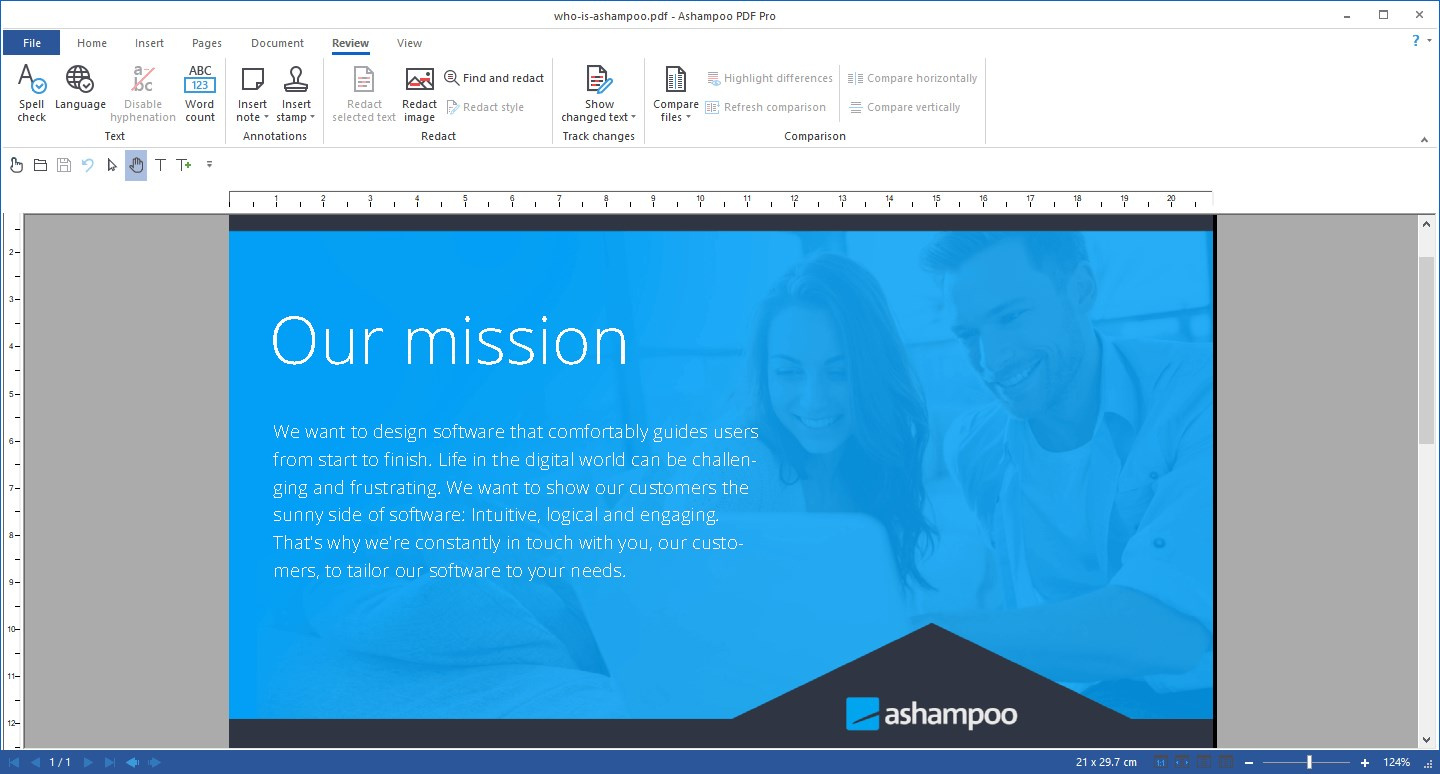 Ashampoo PDF Pro 5 předvídá vaše potřeby a poskytuje znatelné pohodlí při každodenním používání. Když otevřete PDF soubor z Průzkumníka Windows, zobrazí se nyní jako nová karta ve vašem stávajícím okně. Nové zobrazení Rozvržení knihy zobrazuje dvě stránky vedle sebe, stejně jako skutečná kniha, a posouvání po stránkách umožňuje přesunout se přesně o jednu stránku na jedno otočení kolečka myši. Přetáhněte dva soubory PDF do programu a spusťte okamžité porovnání dokumentů, abyste na první pohled viděli rozdíly. Při přidávání textu si Ashampoo PDF Pro 5 pamatuje naposledy použité písmo a velikost, čímž zajišťuje konzistentní vzhled bez nutnosti ručního upravování.