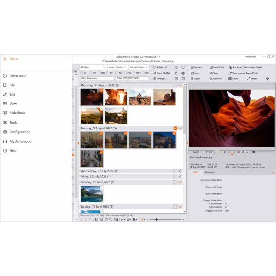 Ashampoo Photo Commander je nielen kompatibilný so systémom Windows 11, ale bol tiež úplne prepracovaný pre skutočnú natívnu 64-bitovú podporu a optimálnu správu pamäte. Je to doteraz najlepšie vyzerajúci, najrýchlejší a najstabilnejší Photo Commander. Či už upravujete jednotlivé snímky alebo celé knižnice, rozdiel pocítite okamžite!