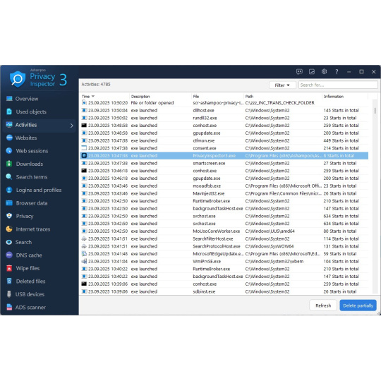 Informace o používání otevřených souborů a složek se neustále shromažďují bez vašeho upozornění. Nechtěli byste vědět, kolik informací o vaší práci váš počítač zaznamenává? Ashampoo Privacy Inspector vám to řekne! Zjistěte přesně, co se děje v zákulisí, když používáte počítač, použijte filtry k upřesnění výsledků a smažte je, kdykoli budete chtít!