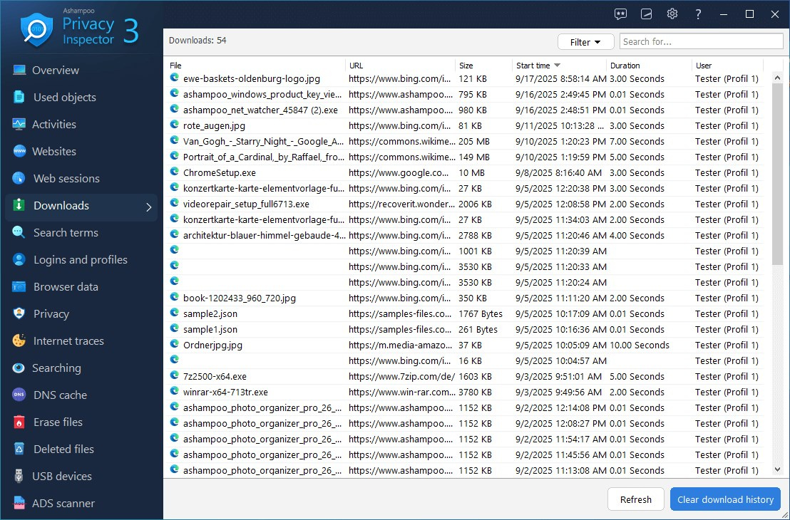 Mějte plnou kontrolu nad historií stahování a vyhledávání. Online zdroj, velikost souboru, doba stahování – s Ashampoo Privacy Inspector máte všechny potřebné informace na dosah ruky – nejen vy, ale i kdokoli jiný, kdo používá váš počítač! Ale žádné starosti, vestavěné filtry vám pomohou identifikovat a smazat citlivé informace během chvilky. Chcete se vrátit k nedávné stránce, ale zapomněli jste, jak se na ni dostat? Ashampoo Privacy Inspector vám s tím také pomůže!