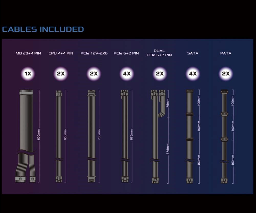 | Dvojitý PCIe 6+2 Pin Konektor | 2x / 2x (675 + 75 mm) |