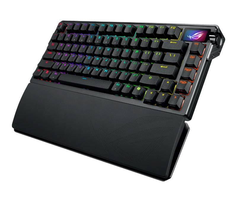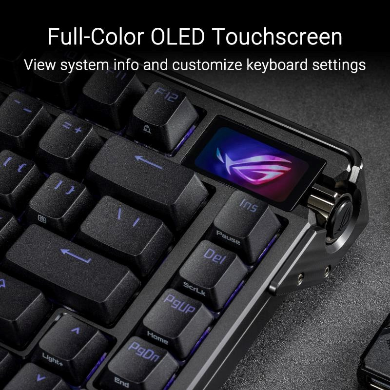 ROG Azoth Extreme je prispôsobiteľná 75% herná klávesnica s prémiovým šasím z hliníkovej zliatiny a kovovým rámom. Vyznačuje sa rýchlosťou hlásenia 8000 Hz s ROG Polling Rate Booster a viac než 1600 hodín výdrže batérie v bezdrôtovom režime ROG SpeedNova 2,4 GHz. Vylepšený OLED dotykový displej a trojpólový knoflík umožňujú sledovanie systému a rýchle nastavenie. Polohovacia doska z uhlíkovej ocele zabezpečuje ostrý zvuk pri písaní, zatiaľ čo tri tlmiace vrstvy absorbujú vibrácie. Nastaviteľný držiak tesnenia s pádly spínača ponúka dve možnosti písania.