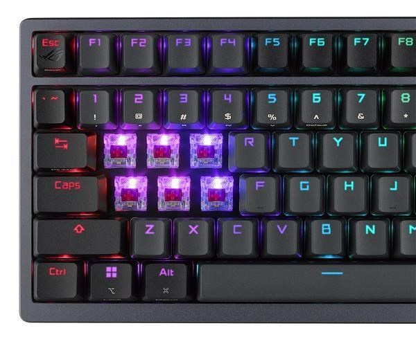 - Mechanické spínače ROG NX vyměnitelné za provozu: Předem namazané spínače pro hladší cvakání a eliminaci odskakování; rychlé ovládání a vyladěné křivky síly ROG poskytují skvělý pocit a konzistenci kláves