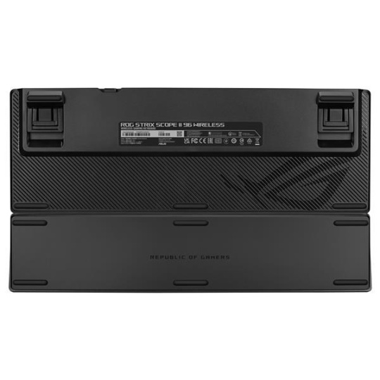 Bezdrôtová herná klávesnica ROG Strix Scope II 96 s pripojením v troch režimoch, klávesové skratky pre streamovanie, multifunkčné ovládacie prvky, mechanické spínače ROG NX s možnosťou výmeny za prevádzky, stabilizátory klávesnice ROG, krytky kláves PBT doubleshot a silikónová tlmiaca pena, tri uhly sklonu a opierka zápästia