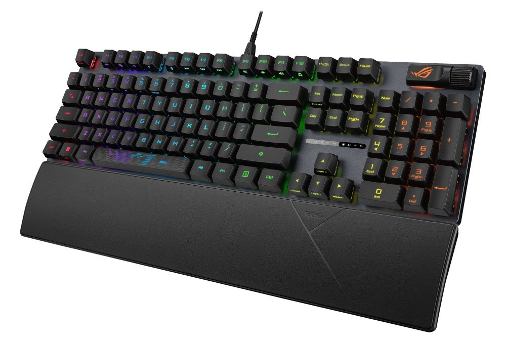 Herná klávesnica ROG Strix Scope II s predom namazanými mechanickými spínačmi ROG NX Snow a NX Storm, penou tlmiacou zvuk, dvojitými krytkami kláves PBT alebo ABS s UV povlakom, klávesovými skratkami na streamovanie, multifunkčnými ovládacími prvkami, tromi uhlami sklonu a opierkou zápästia