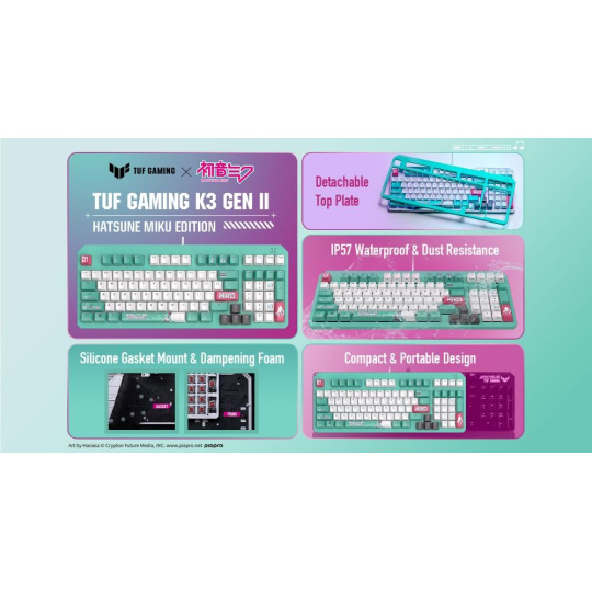 Klávesnica ASUS TUF Gaming K3 Gen II Hatsune Miku Edition s kompaktným rozložením 97 kláves, opticko-mechanickými spínačmi RGB, silikonovým tesnením, tlmiacou penou, vodotesnosťou IP57, odnímateľnou hornou doskou a kompatibilitou s technológiou Aura Sync.