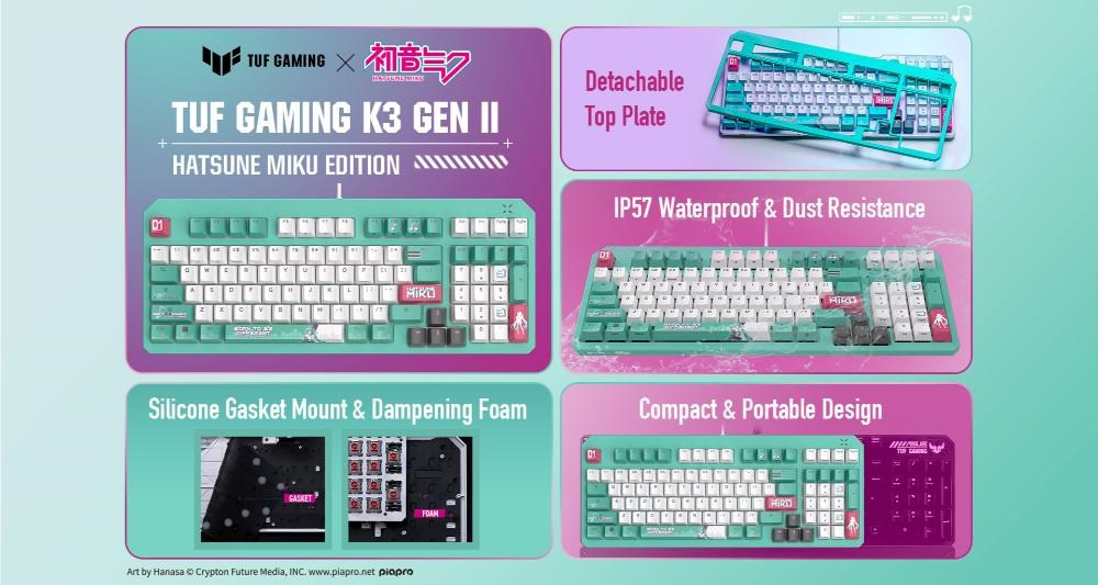 Klávesnica ASUS TUF Gaming K3 Gen II Hatsune Miku Edition s kompaktným rozložením 97 kláves, opticko-mechanickými spínačmi RGB, silikonovým tesnením, tlmiacou penou, vodotesnosťou IP57, odnímateľnou hornou doskou a kompatibilitou s technológiou Aura Sync.