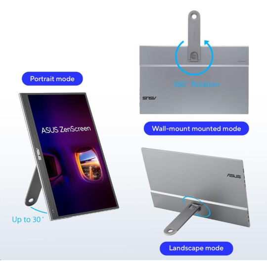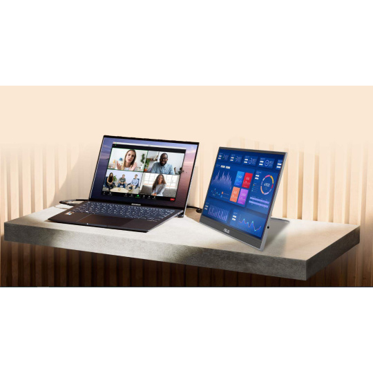 Prenosný monitor ASUS ZenScreen OLED MQ16AHE – 16" (15,6") FHD (1920 x 1080), OLED, 100% DCI-P3, Doba odozvy 1 ms, HDR-10, USB Type-C, Mini HDMI, Senzor priblíženia, 360° stojan, Bez blikania, Low Blue Light