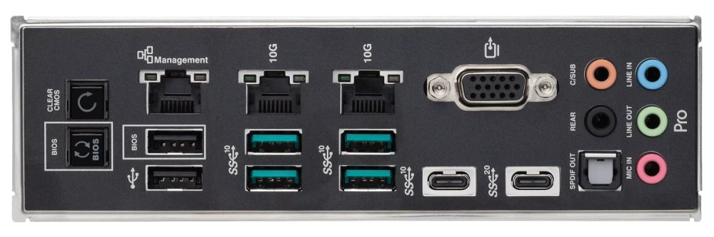 1 x USB 3.2 Gen 2x2 port(s) (1 x USB Type-C) 5 x USB 3.2 Gen 2 port(s) (4 x Type-A + 1 x USB Type-C®) 2 x USB 2.0 port(s) (2 x Type-A) 1 x VGA port 2 x Intel® dual 10Gb Ethernet ports 1 x Realtek 1Gb Ethernet port 5 x Audio jacks 1 x Optical S/PDIF out port 1 x BIOS FlashBack™ button 1 x Clear CMOS button
