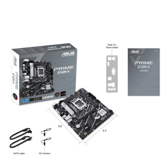 ASUS Prime B760M-K, an Intel® B760 LGA 1700 mATX motherboard with PCIe 4.0, two PCIe 4.0 M.2 slots, DDR5, Realtek 2.5Gb Ethernet, VGA, HDMI™, SATA 6 Gbps, front USB 3.2 Gen 1, Aura Sync